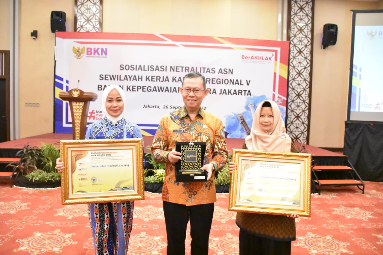 Penghargaan tersebut diterima Sekdaprov Lampung, Fahrizal Darminto mewakili Gubernur Lampung dan diserahkan oleh Plt Kepala BKN Bima Haria Wibisana.