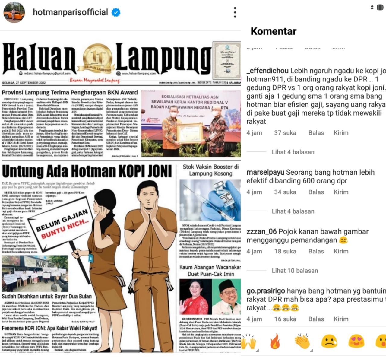 Hari ini, Selasa (28/9/2022), @hotmanparisofficial memposting salah satu media lokal yakni Haluan Lampung dengan isi berita “Fenomena Kopi Joni : Apa Kabar Wakil Rakyat !”.
