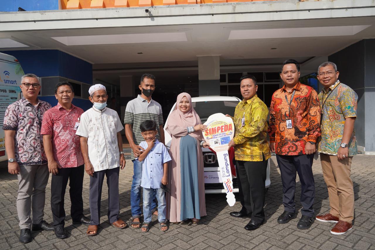 BANDAR LAMPUNG – Direktur Utama Bank Lampung Presley Hutabarat menyerahkan mobil Honda Brio kepada Siti Nurhamiah peraih grandprize undian tabungan Simpeda lokal Bank Lampung periode tahun 2022, Kamis (20/10/2022).