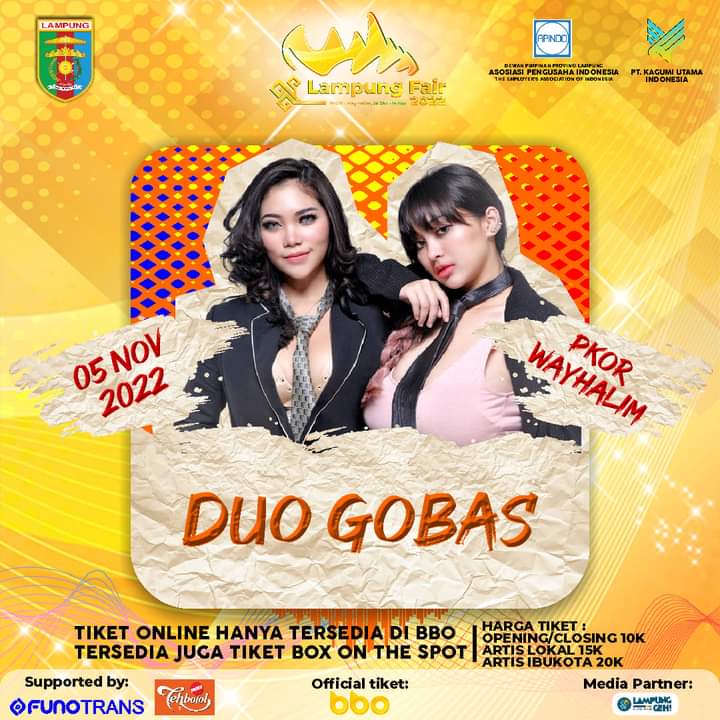 “Duo Gobas siap gilas panggung utama Lampung Fair 2022, mulai jam 9 malam. Di situ juga bakal ada D.A.R.A. tapi bukan Dara The Virgin ya, itu nanti penutupan hehe. Di panggung Intimate Stage, juga bakal ada band lokal juga, Ivana,” ujar Stage Manager Lampung Fair, Angga Saputra Martav, yang juga Ketua Himpunan Musisi Lampung dan pengurus Bidang Pariwisata dan Ekonomi Kreatif DPP APINDO Lampung.
