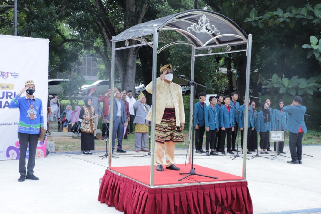 BANDAR LAMPUNG – Plt Rektor Universitas Lampung (Unila) Mohammad Sofwan Effendi, memimpin upacara peringatan Hari Guru Nasional, dengan mengenakan pakaian adat Lampung, Jumat (24/11/2022).