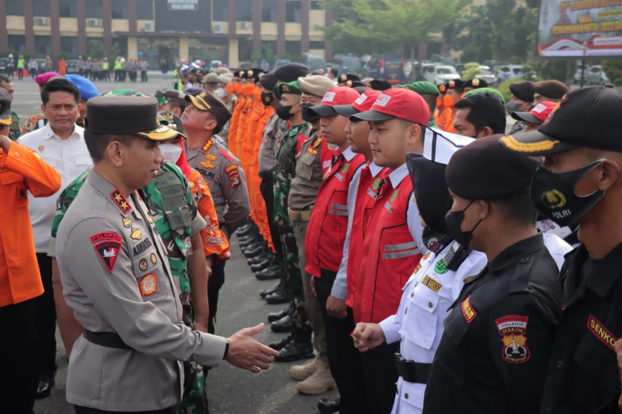 BANDAR LAMPUNG – Kapolda Lampung Irjen Pol Akhmad Wiyagus, pimpin apel gelar pasukan Operasi Lilin Krakatau Tahun 2022, dalam rangka pengamanan perayaan Natal 2022 dan Tahun Baru 2023 (Nataru), di lapangan apel Mapolda setempat, Kamis (22/12/2022).