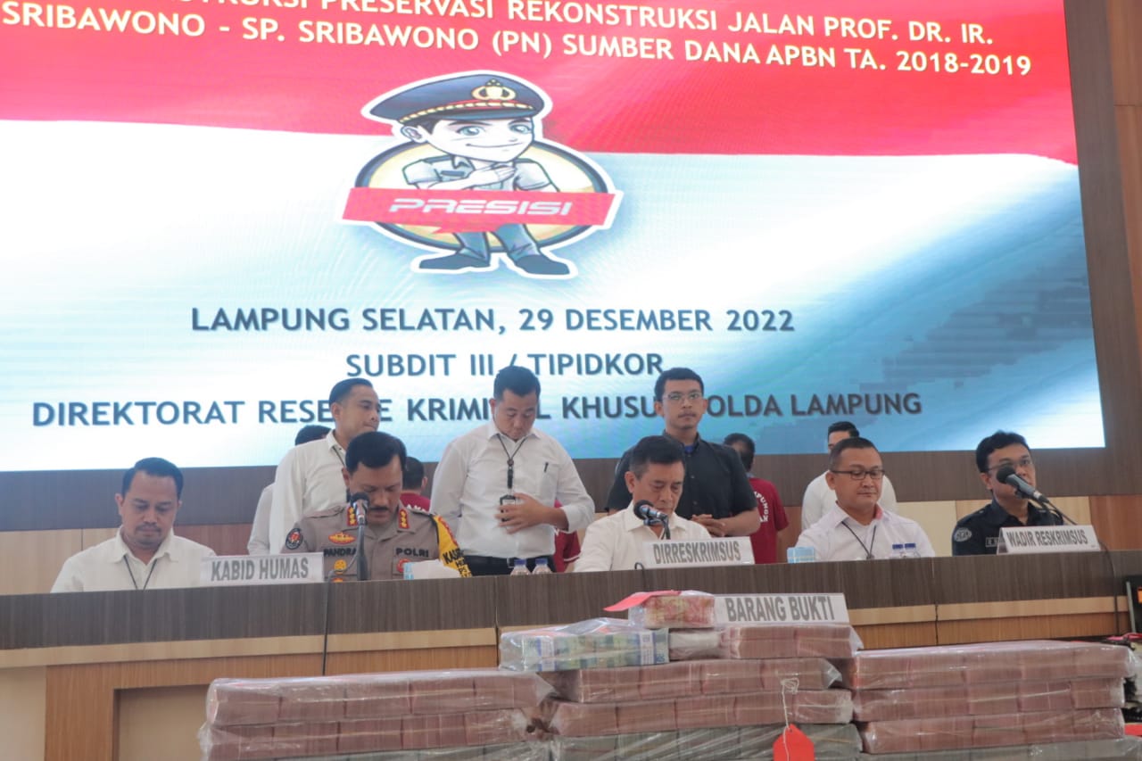 LAMPUNG SELATAN – Direktorat Kriminal Khusus Polda Lampung, gelar ungkap kasus tindak pidana korupsi pekerjaan kontruksi preservasi rekontruksi Jalan Ir Sutami-Sribowono-Sp Sribowono tahun anggaran 2018-2019.