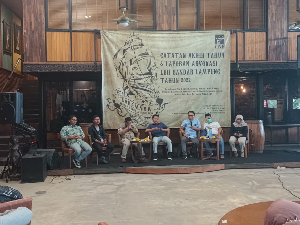 BANDAR LAMPUNG – Lembaga Bantuan Hukum (LBH) Kota Bandar lampung menghelat diskusi dan publikasi catatan akhir tahun 2022, atas terjadinya karamnya hukum dan demokrasi terhadap tatanan kesejahteraan masyarakat.