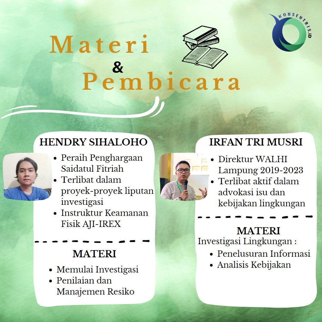 “Workshop kali ini akan menghadirkan dua narasumber, yaitu Direktur Walhi Lampung Irfan Tri Musri dan jurnalis konsentris.id Hendry Sihaloho. Mereka punya kompetensi dan berpengalaman di bidangnya,” kata Yoga.