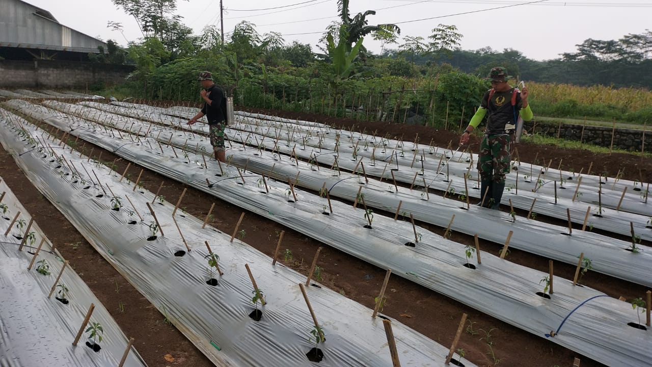 Guna menjaga tanaman agar tetap bagus dan berkembang dengan baik, anggota Kodim 0736/Batang yang tergabung dalam time perawatan tanaman cabai melaksanakan pemupukan atau penyemprotan hama, pada Kamis (2/2/2023).