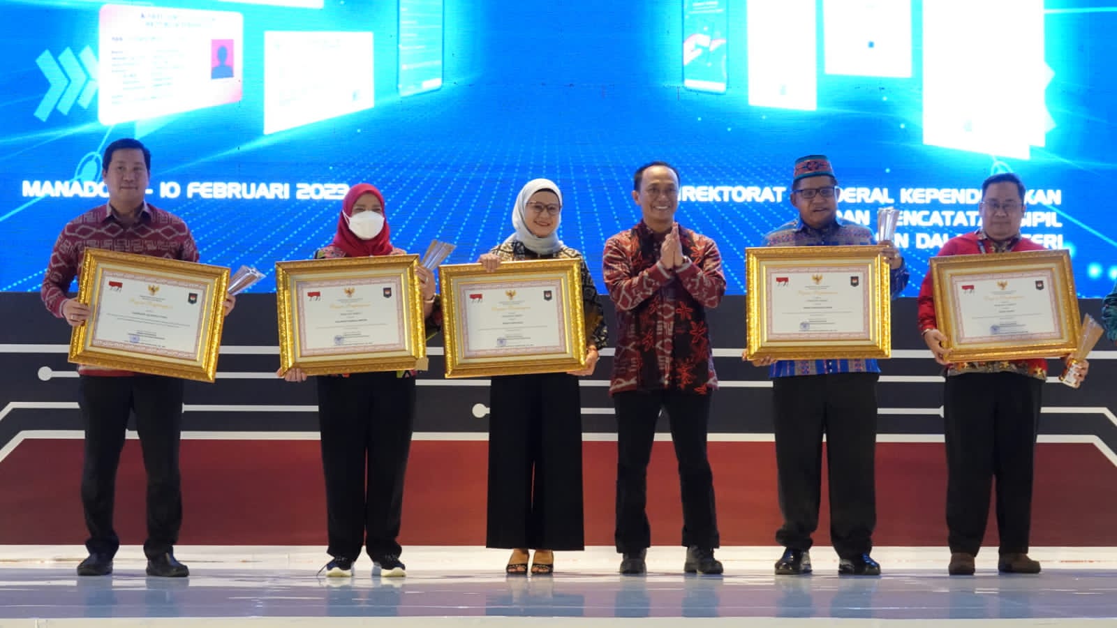 MANADO – Direktorat Jenderal Kependudukan dan Pencatatan Sipil Kementerian Dalam Negeri (Ditjen Dukcapil Kemendagri) memberikan penghargaan kepada Walikota Bandar Lampung Eva Dwiana, Saat Rakornas Kependudukan dan pencatatan Sipil di Manado, Rabu (8/2/2023).