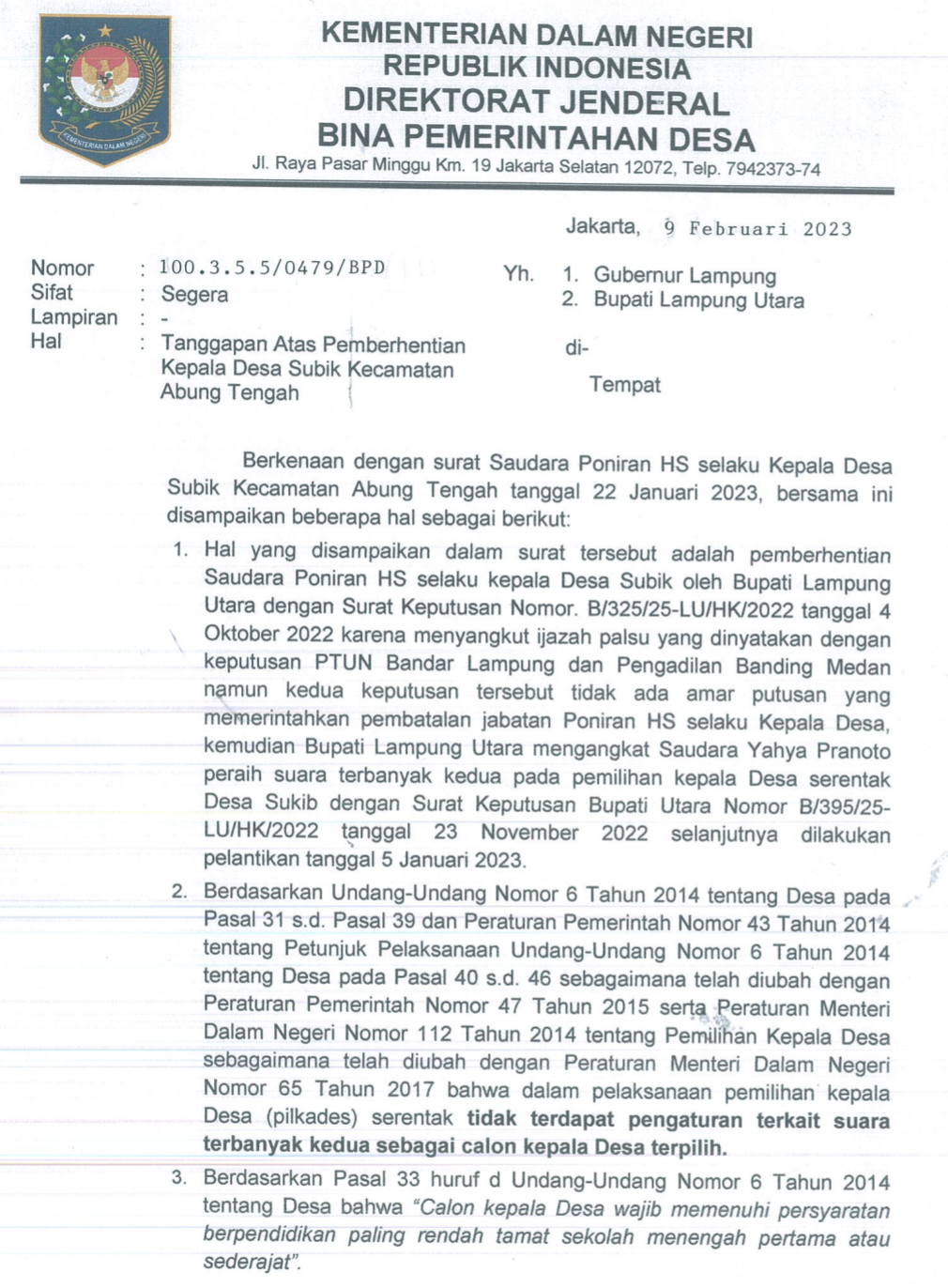 BANDAR LAMPUNG – Kementerian Dalam Negeri (Kemendagri) mengumumkan pembatalan keputusan Bupati Lampung Utara tentang pengangkatan kepala Desa Subik, Kecamatan Abung Tengah, pada Kamis (9/2/2023).