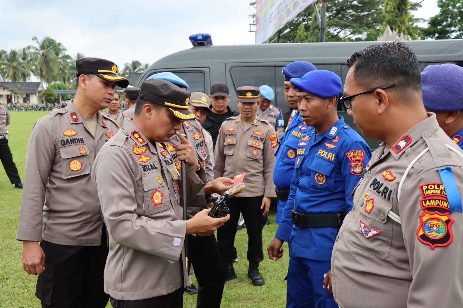 Kapolres Lampung Timur AKBP M Rizal Muchtar, didampingi oleh Waka Polres Lampung Timur dan seluruh pejabat utama Polres Lampung Timur, langsung melakukan pemeriksaan satu per satu seluruh kendaraan dinas dan senpi.