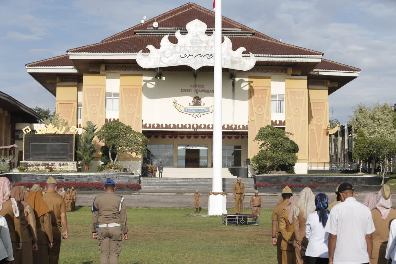 GEDONGTATAAN – Asisten Bidang Pemerintahan dan Kesra Kabupaten Pesawaran, Sunyoto menjadi pembina dalam upacara bendera mingguan, Senin (20/2/2023).