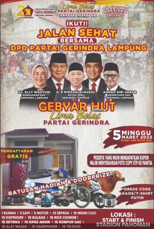 BANDAR LAMPUNG GS – Memperingati hari jadinya yang ke-15, Partai Gerindra mengajak masyarakat Lampung jalan sehat pada Minggu (5/3/2023) pagi. Diperkirakan belasan ribu massa akan tumpah ruah ke acara ini yang akan mengambil sentral di Stadion Pahoman Kota Bandar Lampung itu.