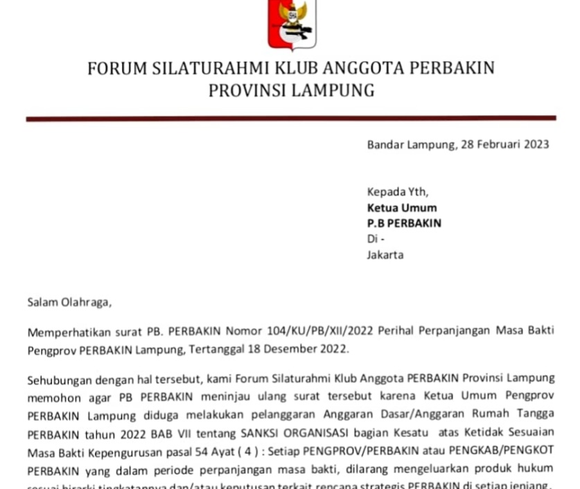 “Kami tak paham adanya surat perpanjang tersebut. PB Perbakin melalui surat nomor 104/KU/PB/XII/2022 memang menyetujui perpanjangan masa bakti kepengurusan Perbakin Lampung. Namun PB Perbakin memerintahkan Perbakin Lampung untuk melaksanakan Musyawarah Perbakin Provinsi Lampung selambatnya sampai 16 Juni 2023, dengan tetap berpedoman kepada ketentuan Anggaran Dasar dan Anggaran Rumah Tangga Perbakin tahun 2022,” jelas Kang Ujang, Rabu (1/3/2023).