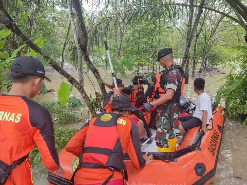 Tulang Bawang – Tim SAR Gabungan evakuasi warga yang terjebak banjir di Astra Ksetra Kec. Menggala Kab. Tulang Bawang pada Kamis (09/03/2023).