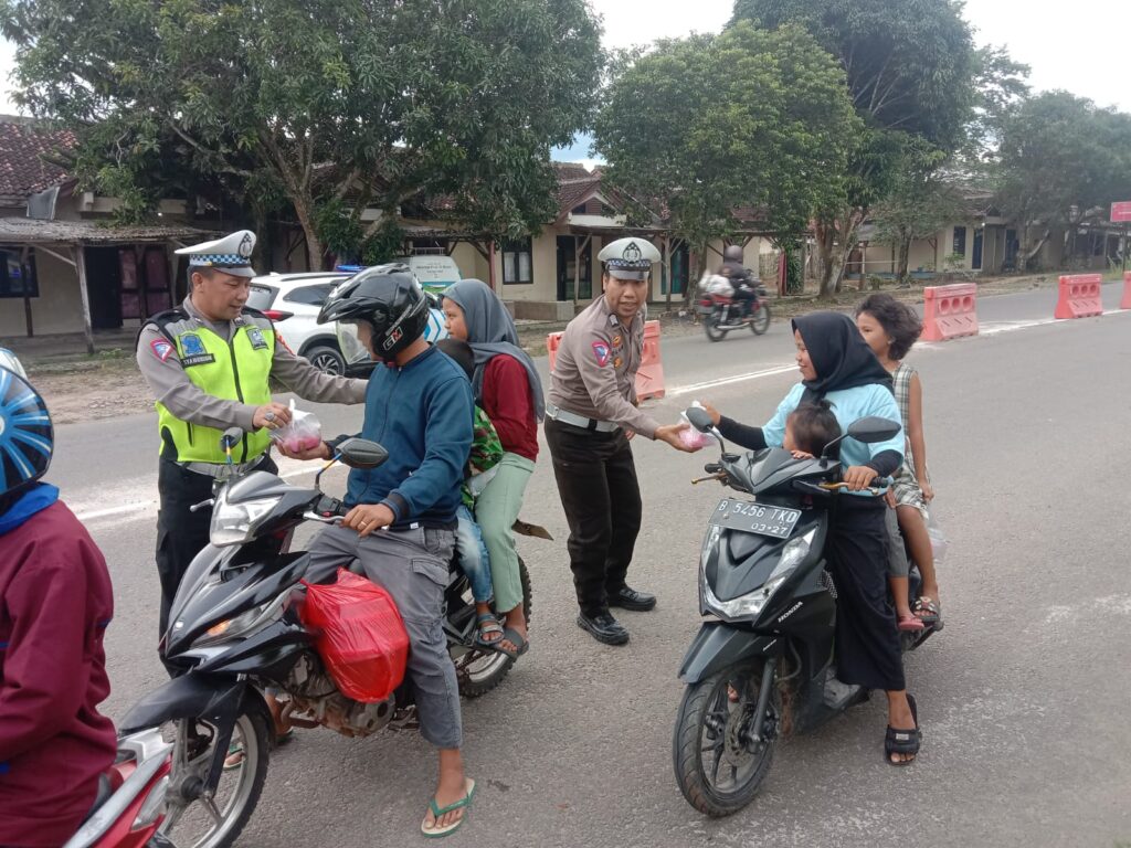 WAY KANAN – Kasat Lantas Polres Way Kanan berbagi takjil kepada para pengguna jalan yang melintas di depan mako polres setempat, pada Sabtu (25/3/2022).