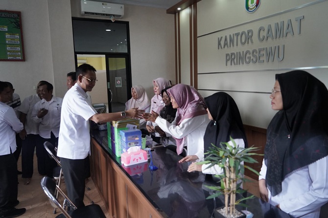 Pj.Bupati Pringsewu Adi Erlansyah didampingi Asisten Pemerintahan dan Kesra Purhadi, M.Kes., Inspektur Andi Purwanto, S.T., M.T., Kepala BKPSDM Eko Sumarmi, S.KM., Kasatpol PP Ibnu Harjianto, S.Pd., M.M. dan Kabag Prokopim Eko Irawan, S.STP., M.M. mengawali sidaknya dengan mendatangi Dinas Kependudukan dan Pencatatan Sipil dan Dinas Penanaman Modal dan Pelayanan Terpadu Satu Pintu di Komplek Perkantoran Pemkab Pringsewu, serta RSUD Pringsewu di Jalan Lintas Barat Sumatera. Kegiatan sidak tersebut diakhiri dengan menyambangi Kantor Kecamatan Pringsewu yang berada di Jalan Veteran Pringsewu Barat.
