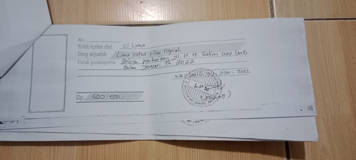 “Iya, memang ada iuran itu. Dimulai dari tahun 2022. Rutin dipungut setiap bulan oleh LPM Kelurahan. Ini bukti kuitansimasih ada semua,” ujar salah satu warga sambil menyodorkan bukti kuitansi ber-cap LPM Kelurahan Way Lunik.