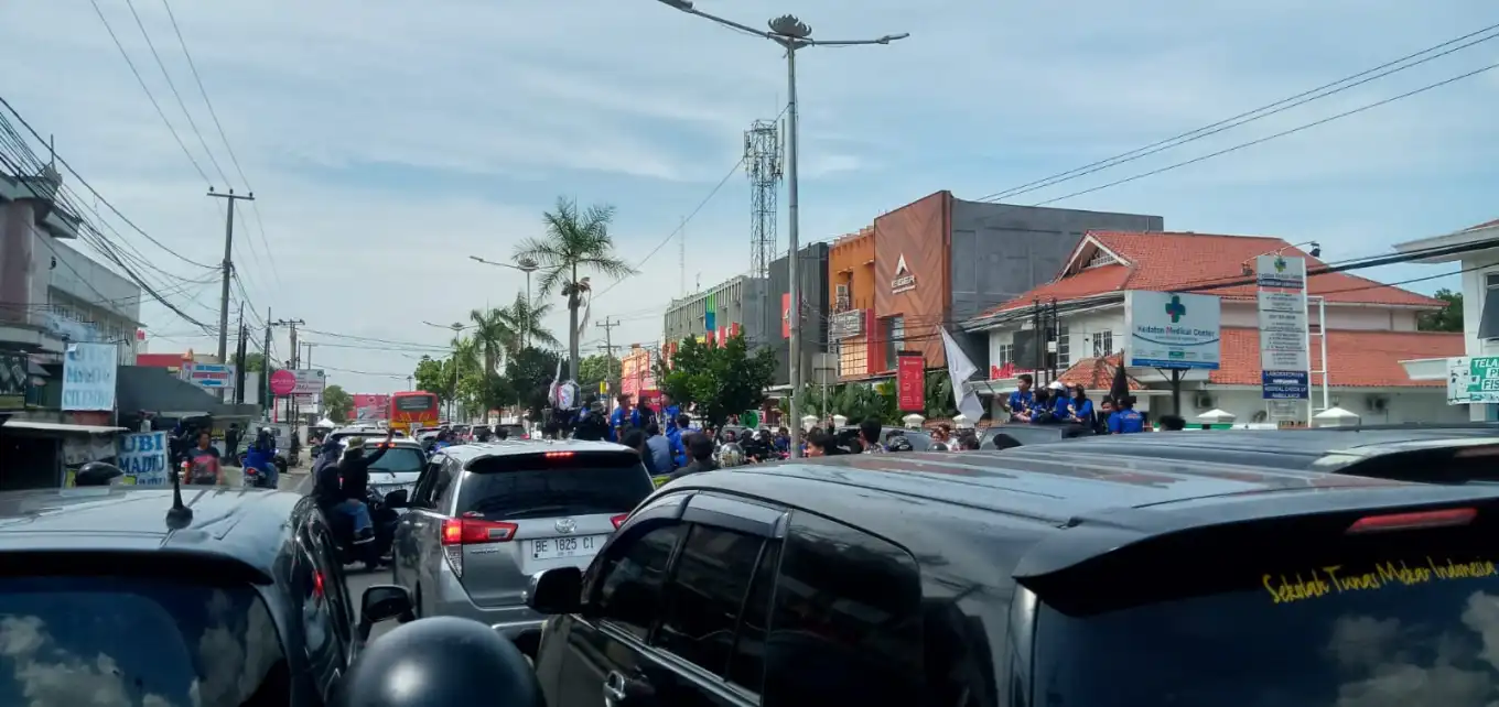 Bandarlampung – Arak-arakan mahasiswa jurusan Teknik Sipil Universitas Bandar Lampung (UBL) sebabkan kemacetan disepanjang Jalan Zainal Abidin Pagar Alam, Kota Bandarlampung, Rabu (24/5/2023).