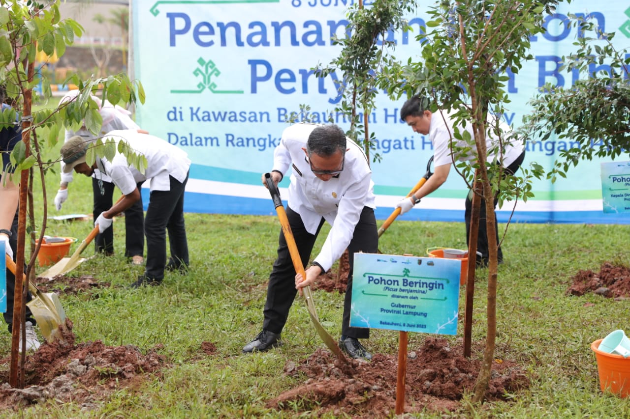 LAMPUNG SELATAN – Pemerintah Provinsi Lampung melakukan penanaman dan penyerahan bibit pohon di Kawasan Wisata Krakatau Park Bakauheni Harbour City, Lampung Selatan, Kamis (08/06/2023), dalam Puncak Peringatan Hari Lingkungan Hidup Sedunia 2023.