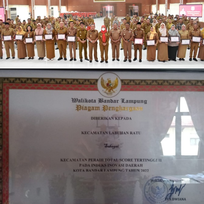 Bandarlampung – Kecamatan Labuhan Ratu raih piagam penghargaan sebagai kecamatan peraih score tertinggi II pada indeks inovasi daerah Kota Bandar Lampung tahun 2022.