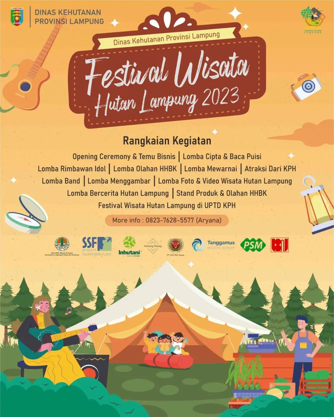 Festival Wisata Hutan 2023 ini akan digelar 3-10 Juli 2023 di kantor UPTD KPH Tahura di Sumber Agung, Bandar Lampung. Festival ini mengundang masyarakat umum merasakan pesona hutan Lampung, perpaduan keindahan alam dan kearifan lokal masyarakat yang tinggal di sekitar hutan.