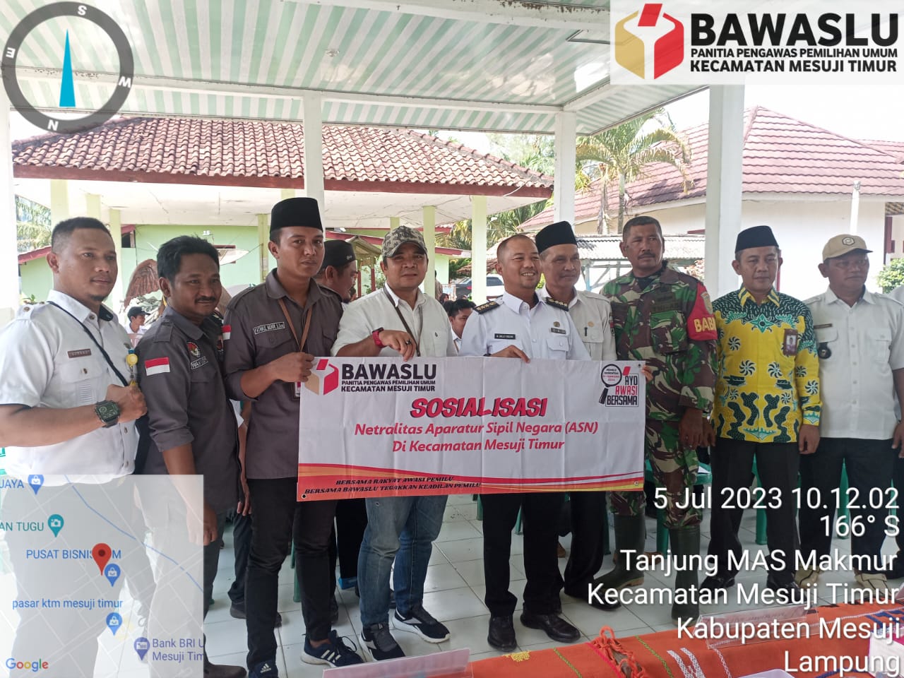 Mesuji – Bawaslu Mesuji melalui Panwaslu Kecamatan Mesuji Timur melaksanakan sosialisasi netralitas ASN Pemilu 2024 dan sekaligus penandatanganan fakta integritas, Rabu (5/7/2023).