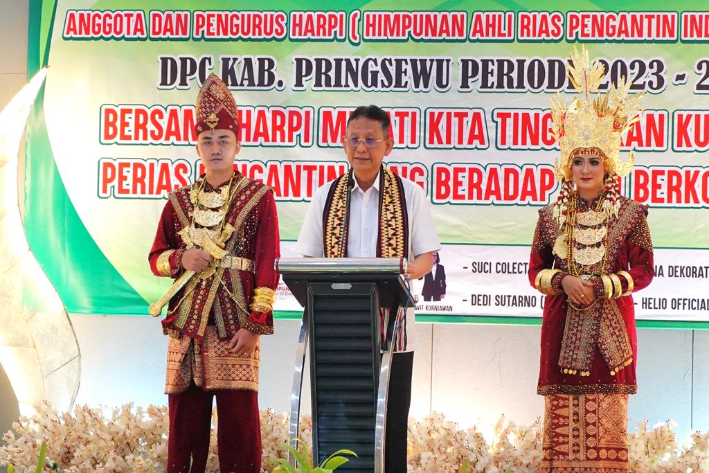 Pringsewu – Pj Bupati Pringsewu Adi Erlansyah mengukuhkan pengurus DPC Himpunan Ahli Rias Pengantin Indonesia atau HARPI Melati Kabupaten Pringsewu 2023-2028.