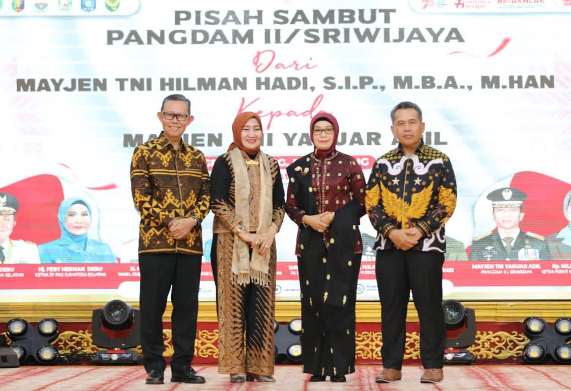 Upacara serah terima jabatan Panglima Komando Daerah Militer (Pangdam) II Sriwijaya berlangsung di Griya Agung, Palembang dihadiri Gubernur Sumsel Herman Deru dan Forkompinda Se-Sumbagsel, Rabu (23/08/2023).