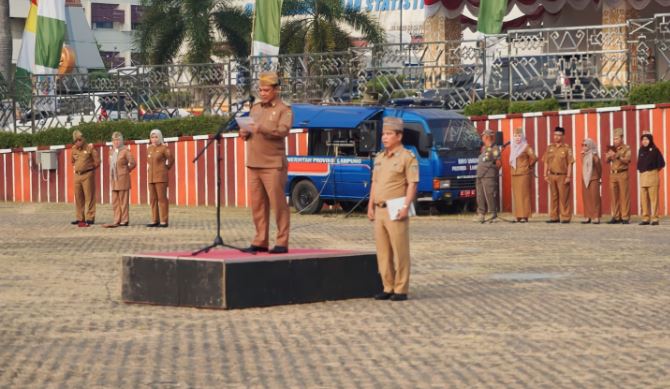 BANDAR LAMPUNG – Gubernur Lampung diwakili oleh Asisten Administrasi Umum, Senen Mustakim, menjadi Pembina Apel Gabungan Mingguan di Lapangan Korpri, Senin (28/08/2023).
