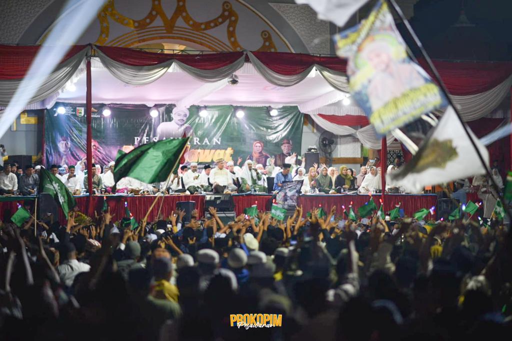 Pesawaran – Bupati Pesawaran, Dendi Ramadhona, dan masyarakat berselawat bersama dalam rangka Hari Jadi ke-16 Kabupaten Pesawaran di Islamic Center Kabupaten Pesawaran, Selasa malam (12/9).