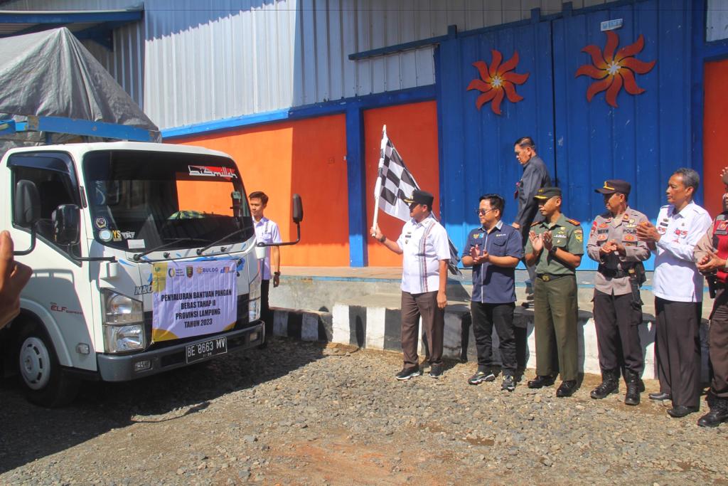 Penyaluran secara simbolis kepada masyarakat Kecamatan Balik Bukit. Berlangsung di Kantor Badan Urusan Logistik (Bulog) Pekon Watas Kecamatan Balik Bukit, Rabu (27/9/2023).