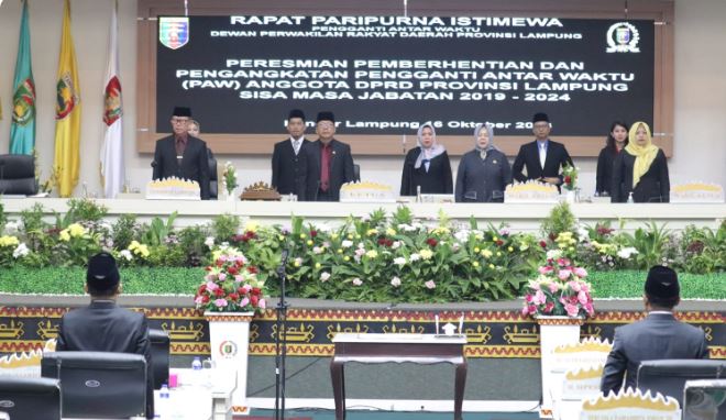 Rapat Paripurna Istimewa DPRD Provinsi Lampung dilaksanakan dalam rangka peresmian pemberhentian dan pengangkatan pengganti antar waktu (PAW) anggota DPRD Provinsi Lampung sisa masa jabatan 2019-2024.