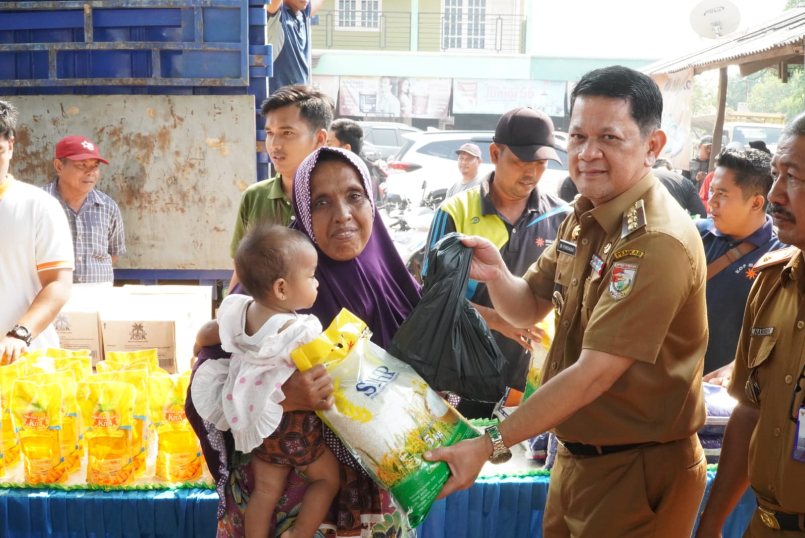 Panaragan – Pj Bupati Tubangbawang Barat (Tubaba), M Firsada, memberikan secara simbolis paket beras kepada masyarakat dalam kegiatan Gelar Pasar Murah di Pasar Daya Murni, Kecamatan Tumijajar, pada Selasa (24/10/2023).