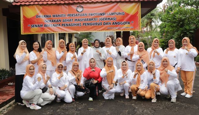 Bandar Lampung – Ketua Dharma Wanita Persatuan (DWP) Provinsi Lampung, Mamiyani Fahrizal, mengikuti kegiatan Gerakan Masyarakat Hidup Sehat (GERMAS) Senam Bersama dengan para penasehat, pengurus dan anggota DWP se-Indonesia melalui Virtual Meeting, bertempat di Kantor DWP Provinsi Lampung, Jumat (01/12/2023).