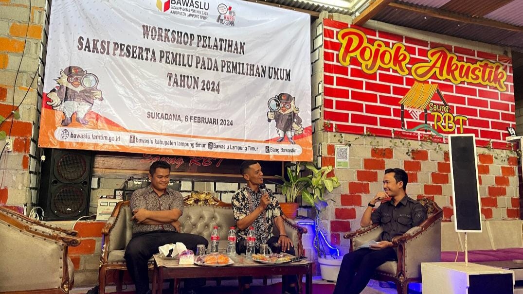 Sukadana – Dalam rangka menyukseskan Pemilu 2024, Bawaslu Kabupaten Lampung Timur, menyelenggarakan workshop pelatihan bagi saksi peserta pemilu pada Selasa (6/2/2024).
