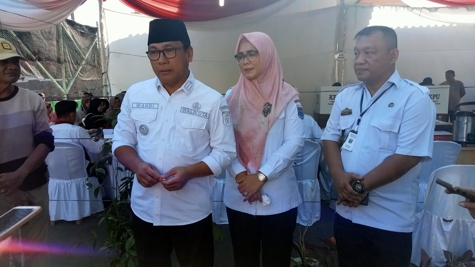 Wahdi tiba di TPS 13 sekitar pukul 08.30 WIB, mengenakan kemeja warna putih didampingi istrinya Silvia Maharani.