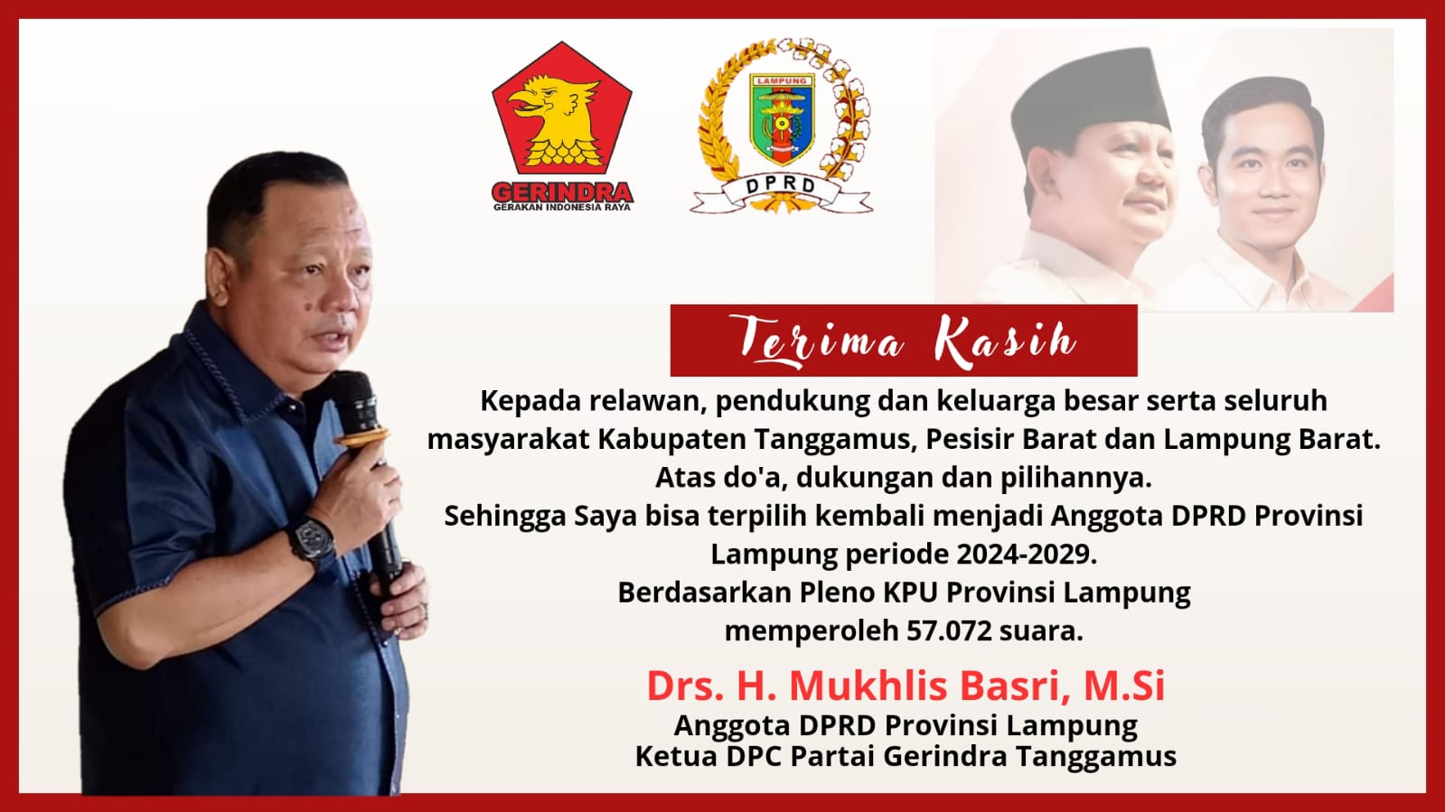 Mukhlis Basri mengucapkan terima kasih kepada relawan, kader, pendukung, keluarga, dan seluruh masyarakat yang telah mendukungnya.
