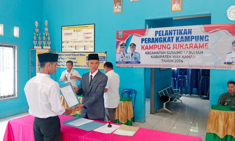 Waykanan – Kepala Kampung Sukarame, Wiwin Abidin, sukses melantik Johan Ramusta sebagai aparat kampung di bagian Kasi Pelayanan.