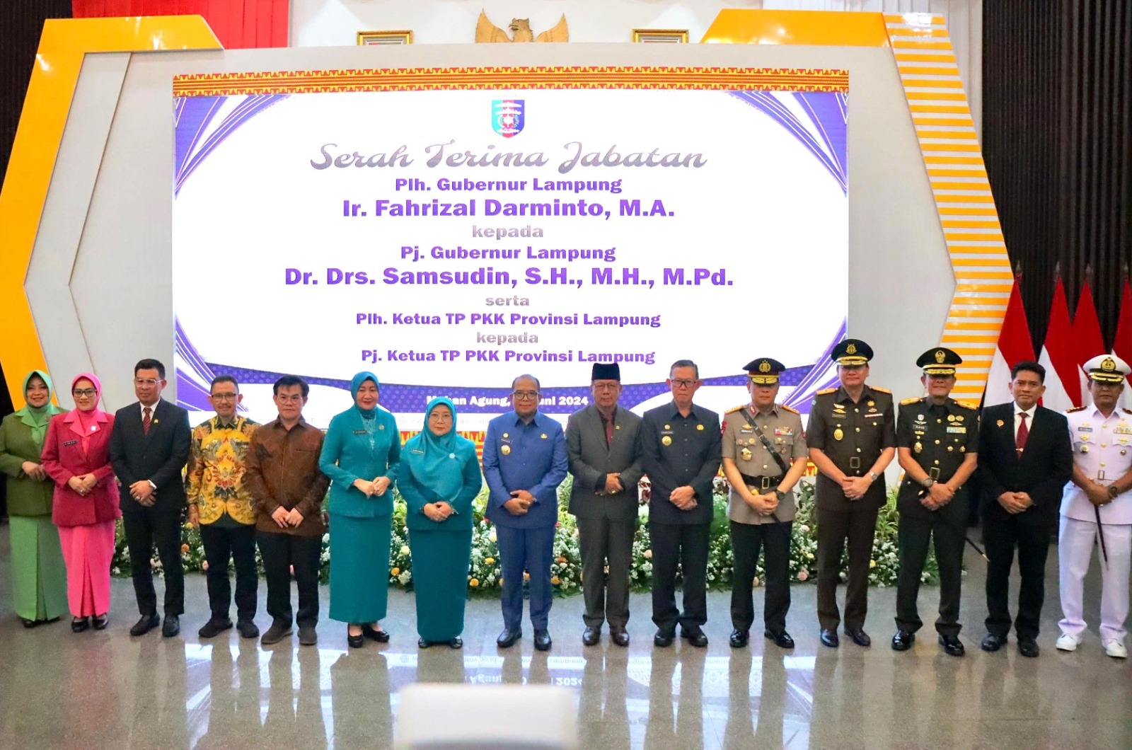 Lampung – Bertempat di Mahan Agung Jl. Dr. Susilo Teluk Betung Bandar Lampung, Kamis (20/6/2024) Komandan Korem 043/Gatam Brigjen TNI Rikas Hidayatullah, S.E., M.M., menghadiri Serah Terima Jabatan dari Plh. Gubernur Lampung Ir. Fahrizal Darminto, M.A., kepada Pj. Gubernur Lampung Dr. Drs. Samsudin, S.H., M.H., M.Pd.