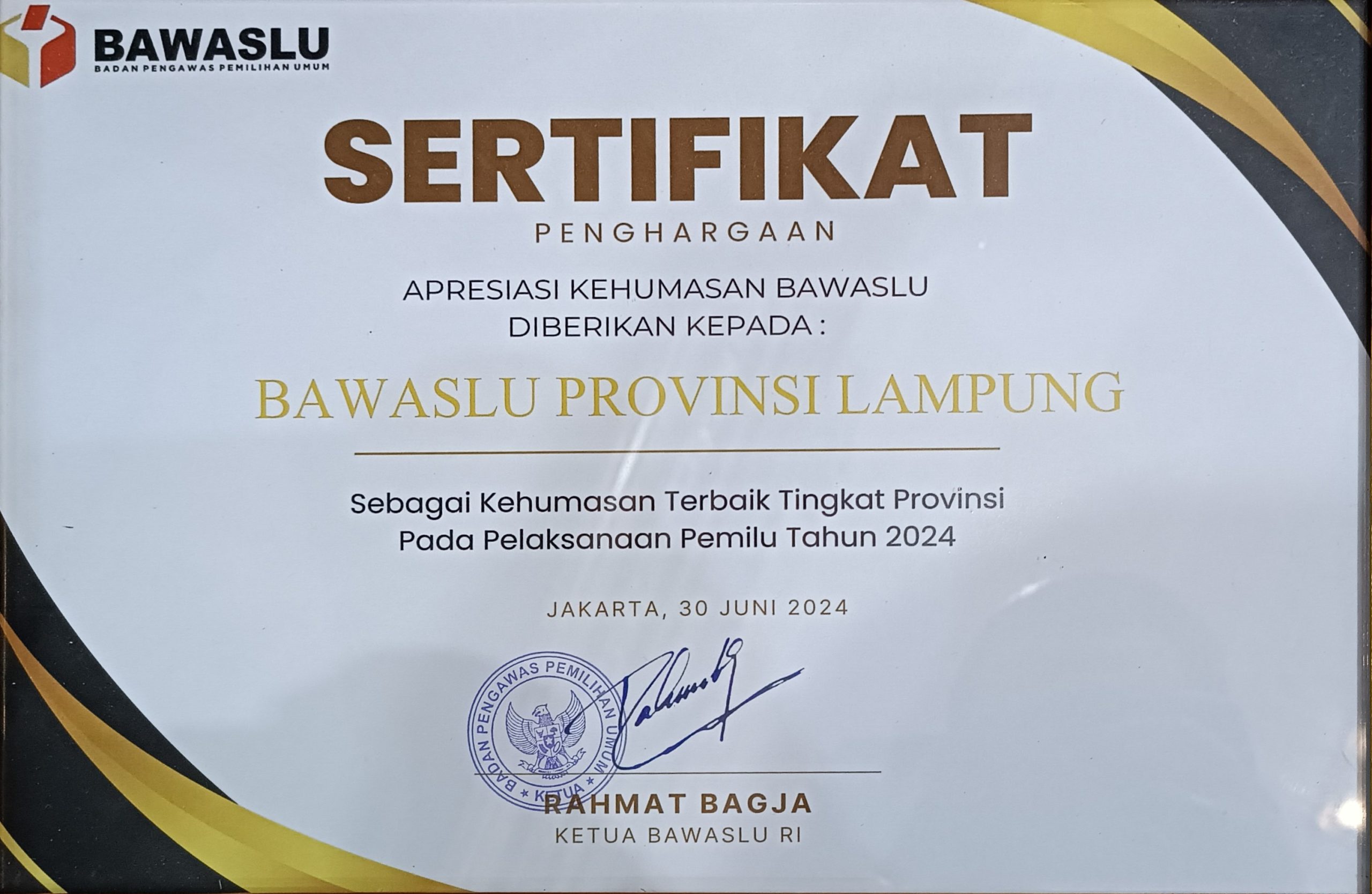 Jakarta – Sebagai wujud apresiasi terhadap kinerja Hubungan Masyarakat (Humas), Bawaslu Provinsi Lampung menerima Apresiasi sebagai Kehumasan Terbaik tingkat Provinsi dari Bawaslu RI dalam pelaksanaan Pemilu 2024.