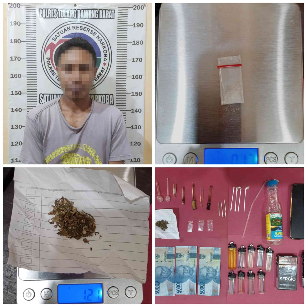“Pelaku ditangkap di sebuah rumah yang terletak di Tiyuh Gading Kencana dan mengamankan 1 (satu) bungkus plastik klip bening ukuran kecil yang didalamnya berisi kristal-kristal bening diduga narkotika jenis Shabu dengan berat bruto 0,17 gr, 2 (dua) bungkus plastik klip bening ukuran kecil kosong bekas pakai, 1 (satu) lembar kertas warna putih yang didalamnya berisi daun-daun kering diduga narkotika jenis ganja dengan berat bruto 1,21gr, 4 (empat) buah tabung kaca pirek yang masih terdapat residu, 3 (tiga) buah sumbu pembakar.