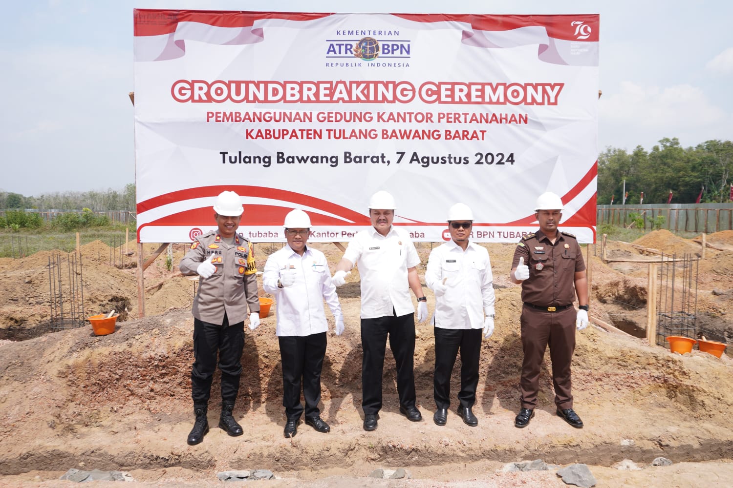 Tubaba – Penjabat (PJ) Bupati Tulang Bawang Barat, Drs. M. Firsada, M.Si., diwakili Staf Ahli Bupati Bidang Pemerintahan, Hukum dan Politik, Untung Budiono, S.Sos., M.H., melakukan Peletakan Batu Pertama (Groundbreaking Ceremony) Pembangunan Gedung Kantor Badan Pertanahan Nasional (BPN) Kabupaten Tubaba, di Tiyuh Pulung Kencana. Rabu (07/08/2024).