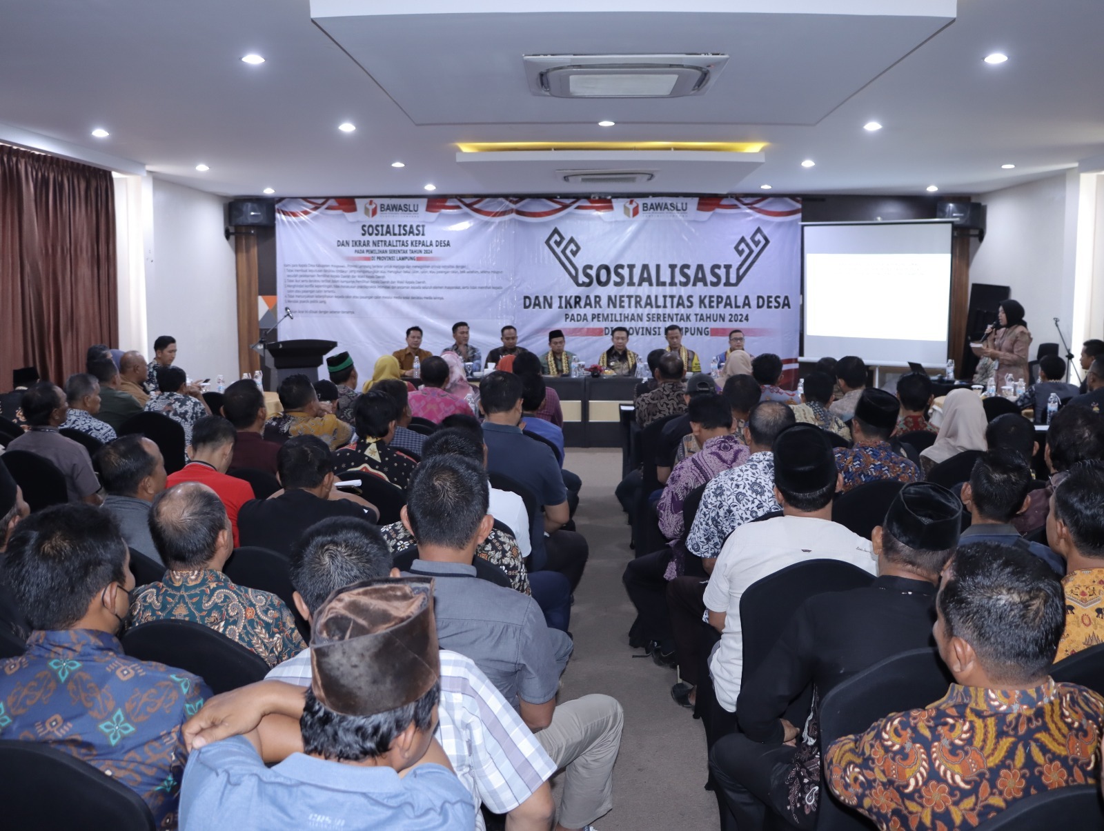 Pringsewu – Badan pengawas pemilu (Bawaslu) kabupaten Pringsewu mengadakan kegiatan sosialisasi dan ikrar netralitas kepala desa /pekon untuk menjaga netralitas serta tidak terlibat dalam praktik politik uang (money politics) pada pelaksanaan Pemilihan Kepala Daerah (Pilkada) Serentak 2024. di Ballroom Hotel Regency Pringsewu pada Jumat (27/9/2024).