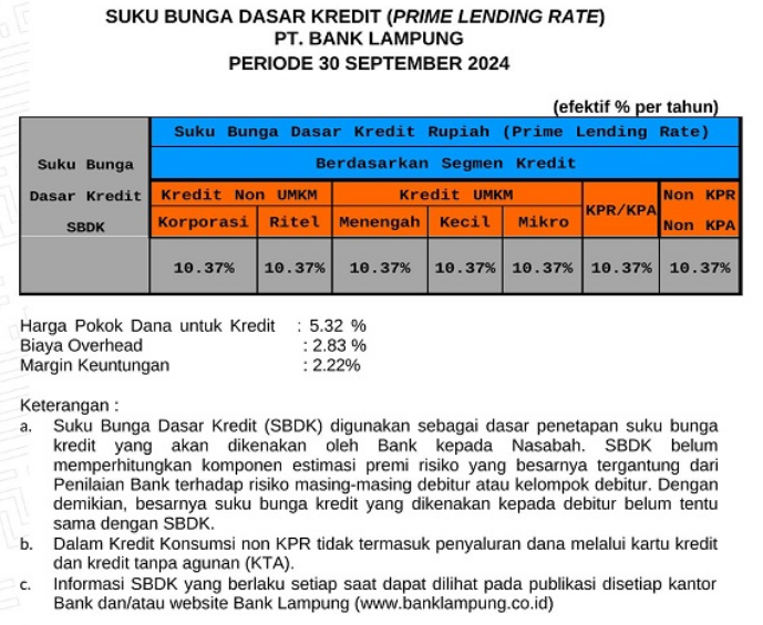 Bank Lampung mengeluarkan Suku Bunga Dasar Kredit (SBDK) (Prime Lending Rate) berdasarkan segmen kredit, periode 30 September 2024. Keterangan SBDK dipublis di laman resmi Bank Lampung, Kamis (3/10/2024).