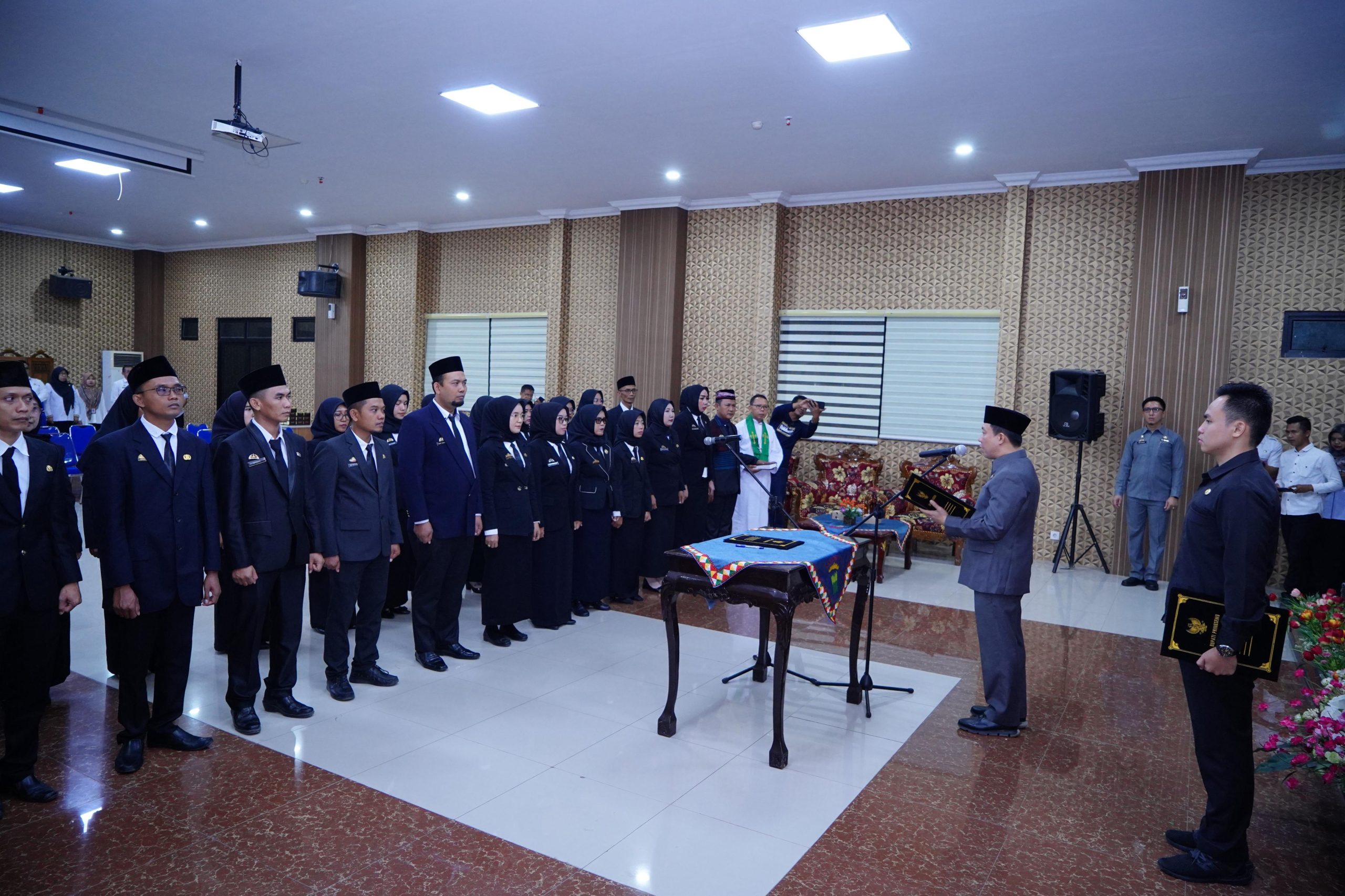 PRINGSEWU — Penjabat (Pj.) Bupati Pringsewu, Marindo Kurniawan, melantik dan mengambil sumpah puluhan guru yang diberi tugas sebagai kepala sekolah di lingkungan Pemerintah Kabupaten Pringsewu. Pelantikan ini digelar di Aula Utama Pemkab setempat pada Rabu (23/10/2024). Para kepala sekolah yang dilantik terdiri dari 24 guru Sekolah Dasar (SD) dan 2 guru Sekolah Menengah Pertama (SMP).