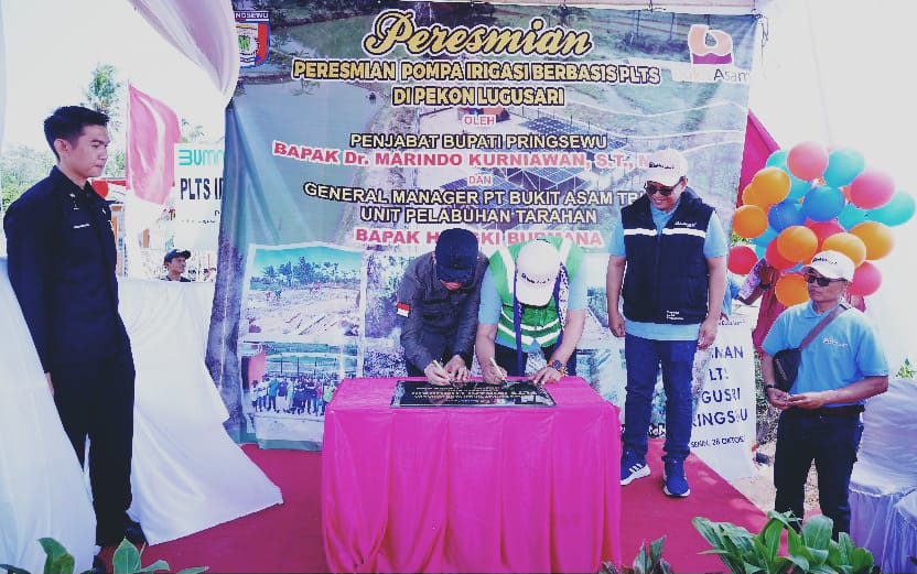 Pompa Irigasi berbasis PLTS ini merupakan bantuan dari PT. Bukit Asam (PTBA) Tbk melalui program Corporate Social Responsibility (CSR). Pompa tersebut menggunakan 40 unit panel surya, masing-masing berdaya 585 WP, yang dapat menghasilkan daya listrik sebesar 23 kW, dengan 1 unit pompa berdaya 18,5 kW, dan 1 unit inverter berdaya 23 kW, yang akan menjadi aset pekon setempat.