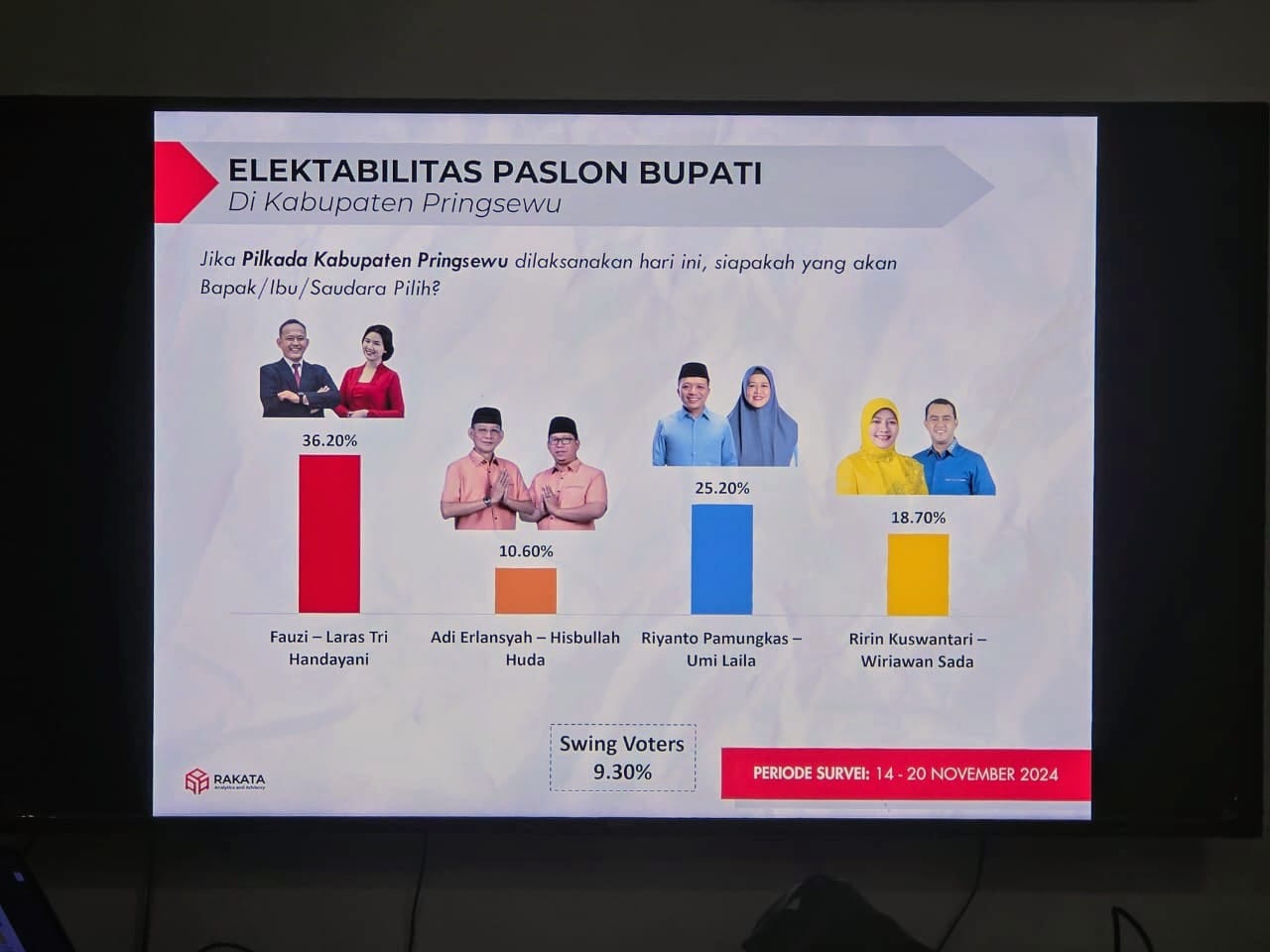 PRINGSEWU – Lembaga Survei Rakata Institute merilis hasil Survei periode terbaru di Kabupaten Pringsewu Provinsi Lampung yang dilaksanakan dari tanggal 14 – 20 November 2024.