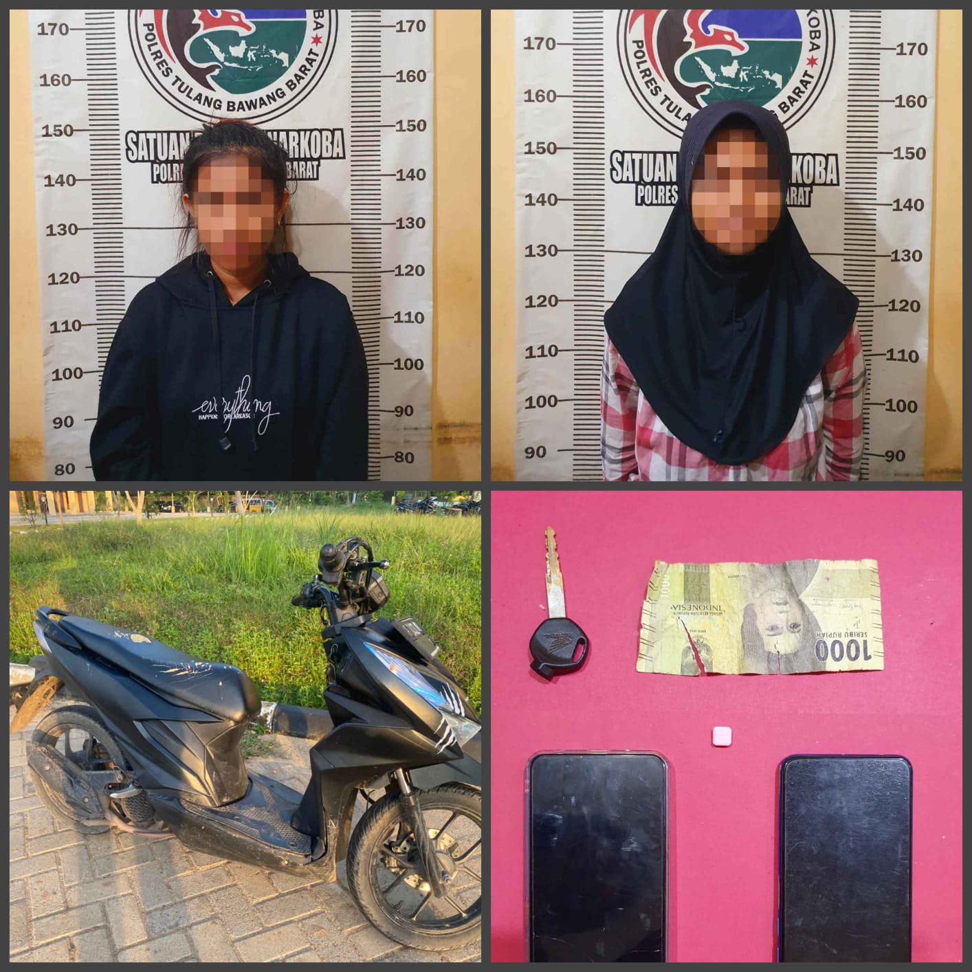 “Kedua Pelaku ditangkap sedang berada di jalan poros Kel. Panaragan Jaya Kec. Tulang bawang tengah Kab.Tulang Bawang Barat, Dan berhasil mengamankan 1 (satu) butir pil warna merah yang diduga narkotika jenis Extacy, 1 (satu) lembar uang kertas pecahan Rp. 1000 (seribu rupiah), 1 (satu) unit handphone android merk VIVO Y03T warna biru, 1 (satu) unit handphone android merk OPPO 16E warna biru, 1 (satu) buah tas selempang warna hitam, 1 (satu) unit motor merk Honda BEAT warna hitam dengan nopol BE 2432 QD beserta kunci kontak.” Ungkap Jefry