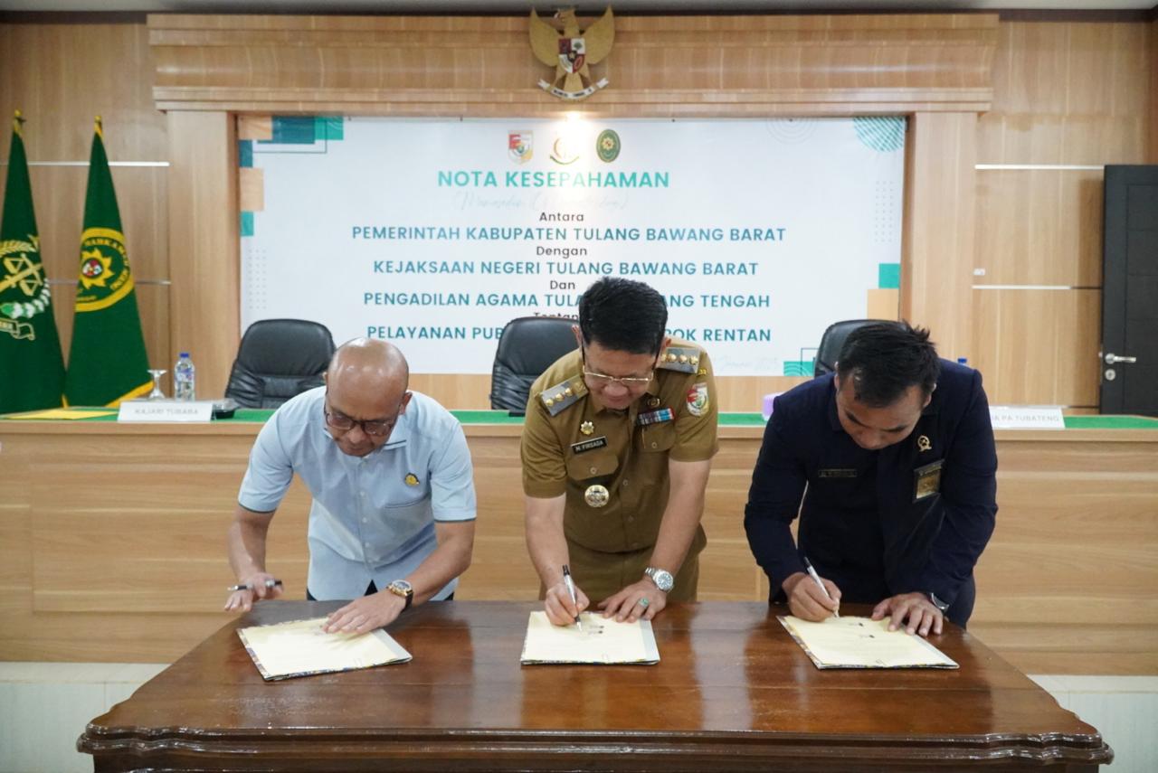 Tubaba – Pemerintah Kabupaten Tulangbawang Barat (Tubaba), Kejaksaan Negeri Tubaba serta Pengadilan Agama Tulangbawang tengah lakukan Penandatangan Kesepakatan Kerjasama Tentang Pelayanan Publik Ramah Kelompok Rentan.