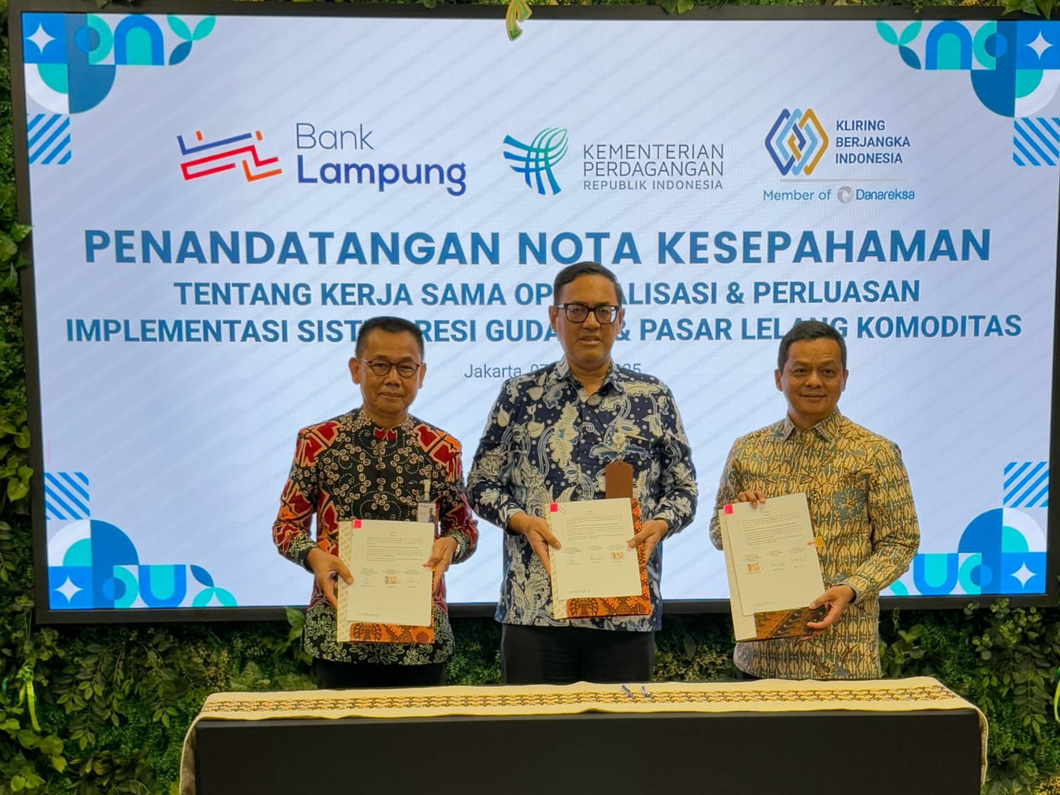 Penandatanganan kerja sama dilakukan langsung oleh Direktur Utama Bank Lampung, Mahdi Yusuf; Kepala BAPPEBTI, Tirta Karma Senjaya; dan Direktur Utama PT KBI, Budi Susanto, pada Jumat (7/3/2025).