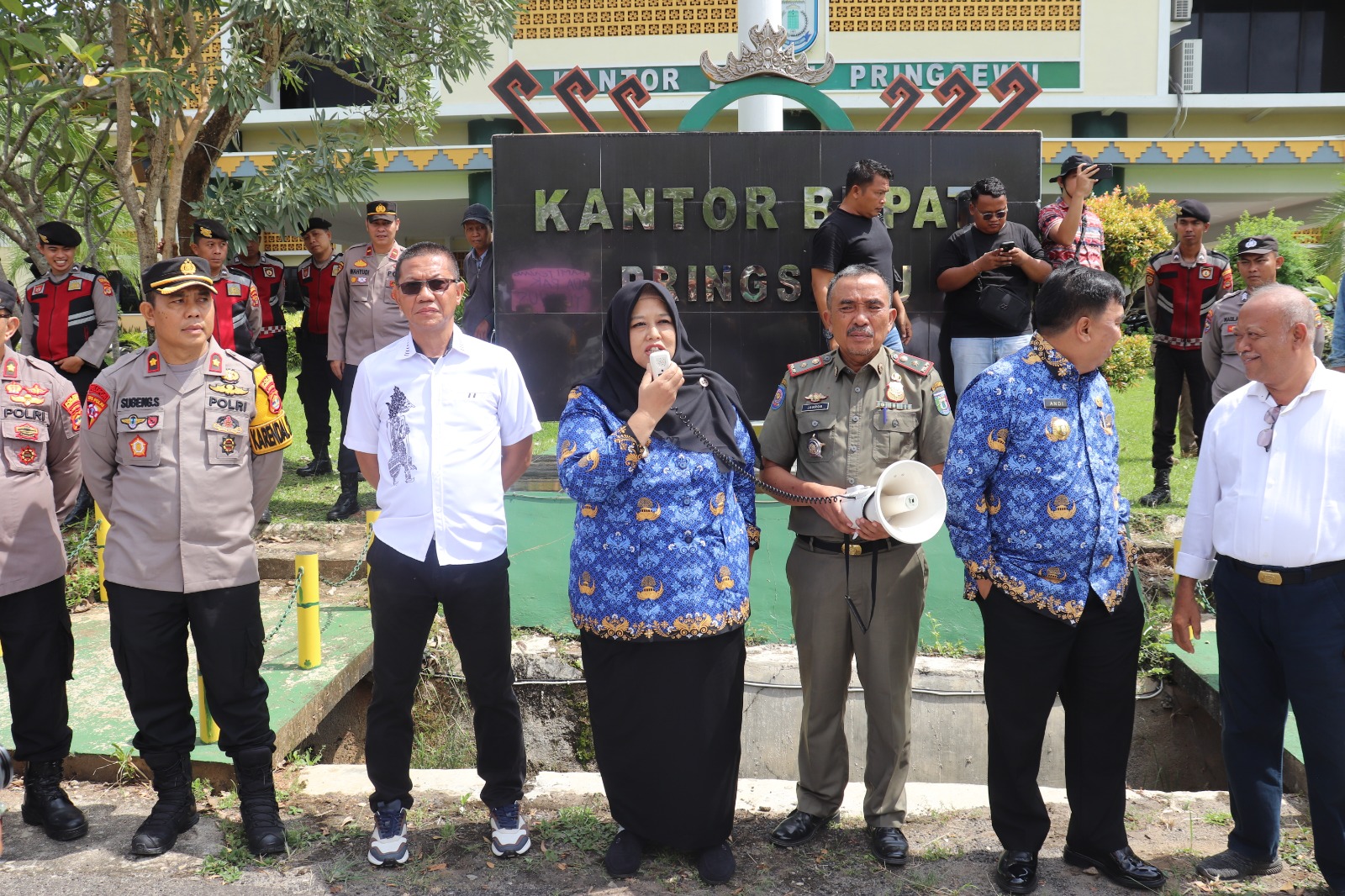 Pringsewu – Puluhan personel Polres Pringsewu dikerahkan untuk mengamankan aksi damai yang digelar ratusan peserta dari berbagai elemen masyarakat di halaman Kantor Bupati Pringsewu, Senin (17/3/2025).